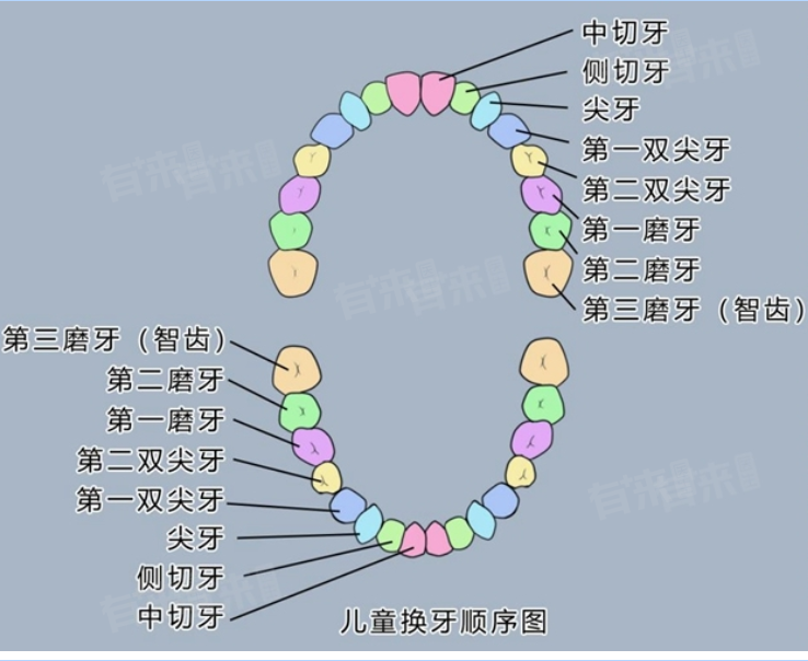 2、恒牙替换乳牙阶段:大约从6岁开始,儿童进入换牙期。首先是第一恒磨牙,也就是俗称的“六龄齿”,在乳牙列的最后方萌出,不替换任何乳牙。与此同时,下颌中切牙开始松动,被恒牙替换,这标志着换牙的正式开始。7-8岁时,上颌中切牙替换乳牙萌出。8-9岁侧切牙完成替换。9-12岁第一、二双尖牙(前磨牙)依次萌出,替换第一、二乳磨牙。10-12岁乳尖牙被恒尖牙替换,12-13岁第二恒磨牙萌出。到17-21岁,第三恒磨牙(智齿)萌出,但智齿并非每个人都会萌出,部分人可能终生不长。
