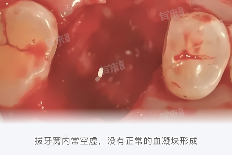 2、血凝块脱落:拔牙后,创口内形成的血凝块对创口愈合至关重要,不仅能保护创口,防止细菌侵入,还为创口愈合提供必要的营养和生长因子。但在某些情况下,血凝块可能过早脱落。例如拔牙后患者过早漱口、刷牙用力过猛、吸吮创口等行为,都可能导致口腔内负压增加,使血凝块松动、脱落。一旦血凝块脱落,牙槽窝直接暴露于口腔环境中,细菌容易侵入,引发感染,进而导致干槽症。