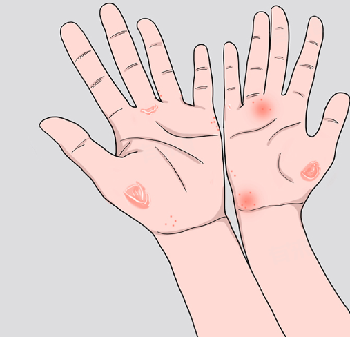 - 手癣:手癣是一种由真菌感染引起的皮肤病,通常表现为手掌的红斑、水疱、脱屑和瘙痒,这种真菌喜欢温暖潮湿的环境,因此手部多汗或长时间接触水的人更容易感染。