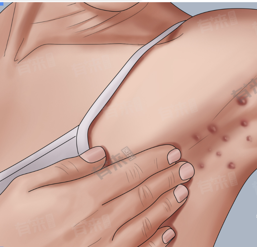 2、皮脂腺囊肿:由于腋窝部位的皮脂腺导管堵塞,皮脂腺分泌物无法正常排出,积聚形成囊肿,表现为圆形肿物,表面光滑,中等硬度,有弹性,与皮肤粘连,不易推动,中央可有一小孔,挤压时可有豆腐渣样物质溢出,易继发感染。