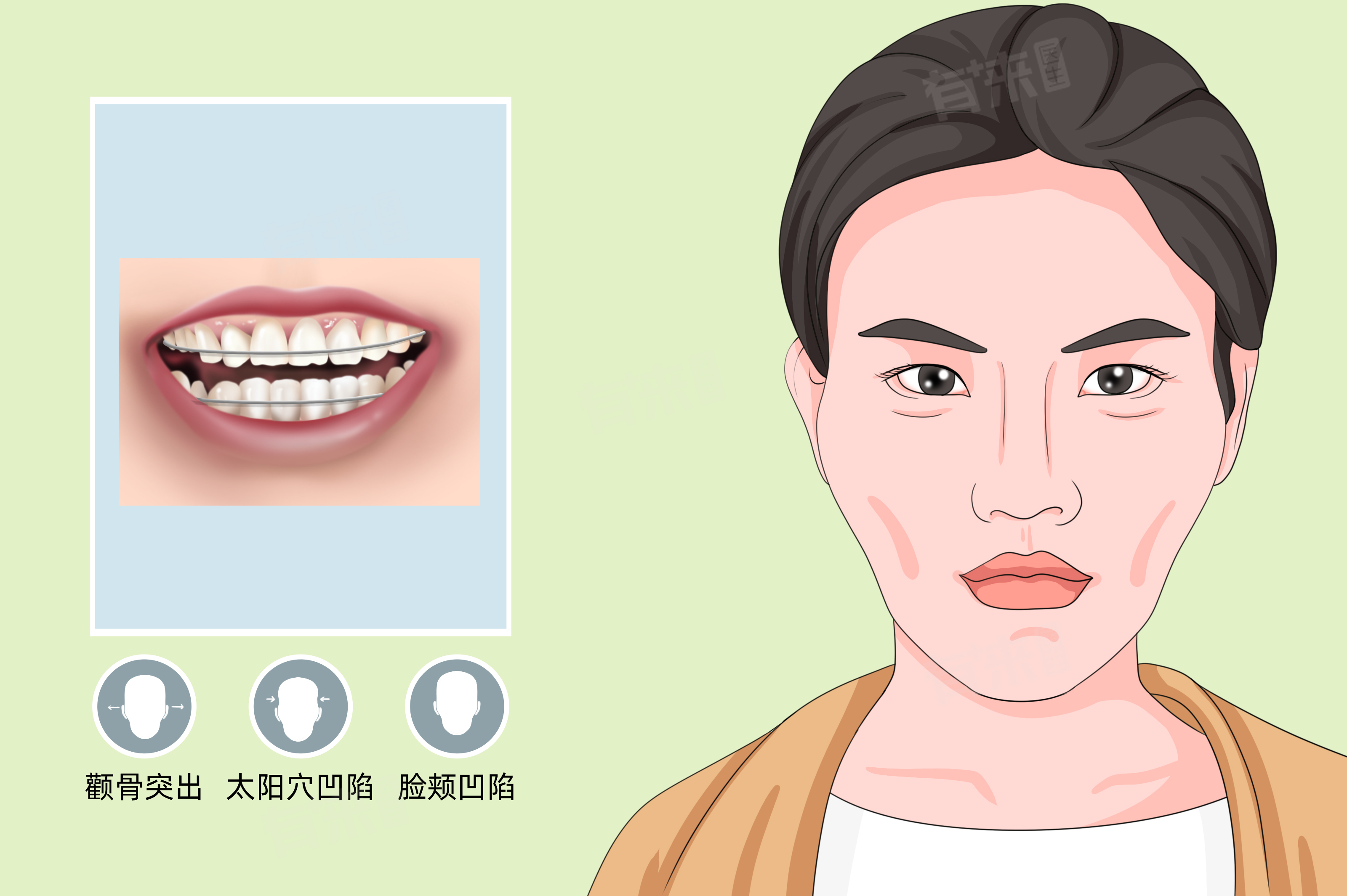 - 牙套脸主要表现为脸颊凹陷、太阳穴凹陷、颧骨突出等,形成原因较为复杂。在佩戴牙套期间,尤其是固定矫治器,由于牙齿的移动和疼痛等原因,患者的咀嚼功能会受到一定程度的影响。很多人会选择吃柔软、易嚼的食物,就减少了咀嚼肌的使用,长期下来咀嚼肌可能会出现一定程度的萎缩。
