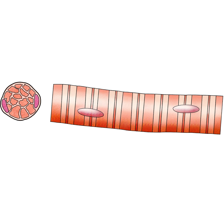 - 骨骼肌:由大量成束的肌纤维组成,每条肌纤维就是一个肌细胞,呈长圆柱形,有多个细胞核,位于细胞周边,肌浆内含有许多与细胞长轴平行排列的肌原纤维,有明显的横纹。