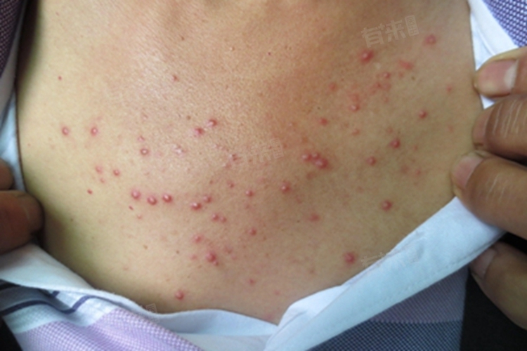 4、毛囊炎:脖子上的毛囊受到损伤或刺激后,容易发生堵塞,引发金黄色葡萄球菌等细菌感染,导致毛囊炎,形成红肿、瘙痒性的脓疱或斑疹。