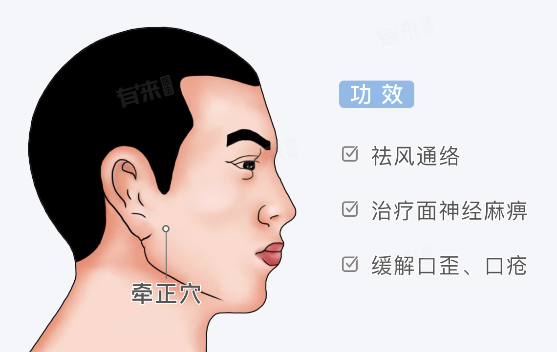 1、祛风通络:牵正穴具有祛风通络的功效。中医理论认为,风邪是导致多种疾病的重要因素之一,而牵正穴则能疏散面部风邪,调和气血,从而改善面神经麻痹、口歪等症状。通过针灸或按摩该穴位,可以疏通经络,促进气血运行,达到治疗疾病的目的。