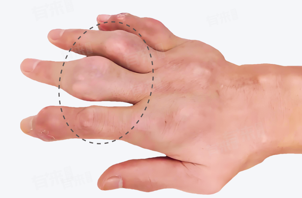 5、痛风性关节炎:当体内嘌呤代谢紊乱,血液中尿酸水平持续升高时,尿酸盐结晶会在关节及周围组织沉积,手指关节便是常见受累部位之一。尿酸盐结晶刺激关节滑膜,引发急性炎症反应,导致关节红肿、剧痛。频繁发作的痛风性关节炎,会使关节周围组织纤维化、骨质破坏,形成痛风石,致使手指关节明显增大、畸形,严重影响关节活动功能。