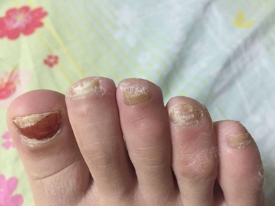3、真菌感染因素:真菌感染是引起脚趾甲发黄的常见且较严重原因,皮肤癣菌、酵母菌等真菌侵犯甲板后,在甲板内大量繁殖,分解甲板的角蛋白,破坏甲板正常结构。初期表现为甲板表面出现小白点,随后逐渐扩大、融合,导致甲板变黄、增厚,质地变脆易碎,甲板与甲床分离。病情严重时,整个甲板被破坏,甚至引发甲沟炎,出现甲周红肿、疼痛等症状。真菌感染具有传染性,若不及时治疗,可蔓延至其他脚趾甲或手指甲。