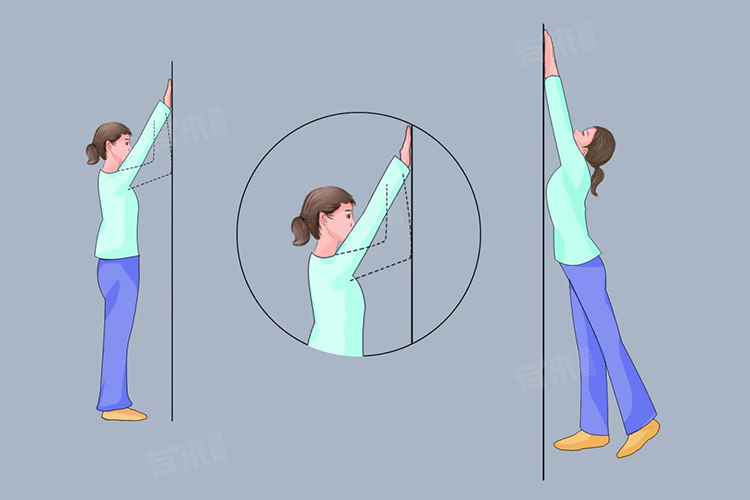 4、手指爬墙法:面对或侧身向墙站立,患侧手指徐徐的上爬,使上臂抬高到最大限度,再沿墙下移,回归原位。锻炼肩关节的外展和外旋功能。