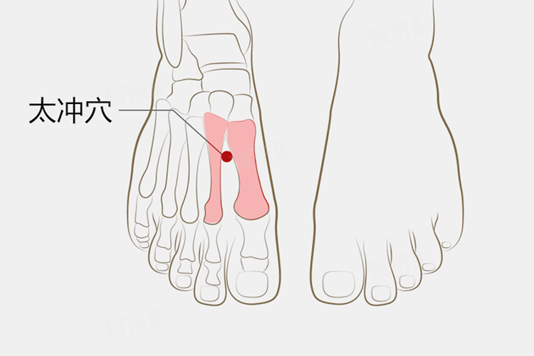 5、太冲穴:位于足背第1、第2跖骨间,约在大拇指指缝向脚背4厘米处。用拇指指腹按压太冲穴,力度适中,每次按摩数分钟,可多次进行。具有疏通肝经的作用,适用于肝阳上亢型的高血压,表现为头痛眩晕、目赤肿痛。