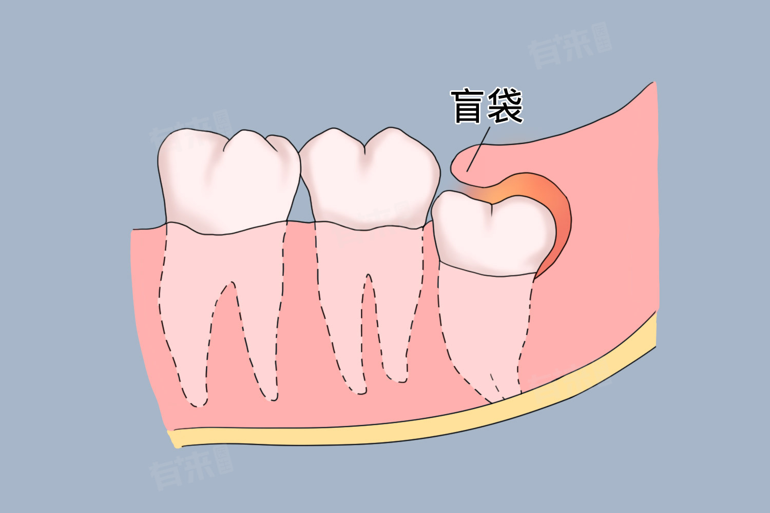 - 智齿盲袋的形成主要源于牙齿萌出不全。当智齿未能完全突破牙龈时,牙龈边缘会覆盖部分牙冠,从而形成一个封闭或半封闭的空间。由于这个空间难以清洁,食物残渣和细菌容易积聚,进而导致局部炎症,即冠周炎的发生。如果患者仅出现轻度不适或偶尔肿胀,可能会误认为是暂时性问题,但实际上,这种情况往往具有反复发作的特点。