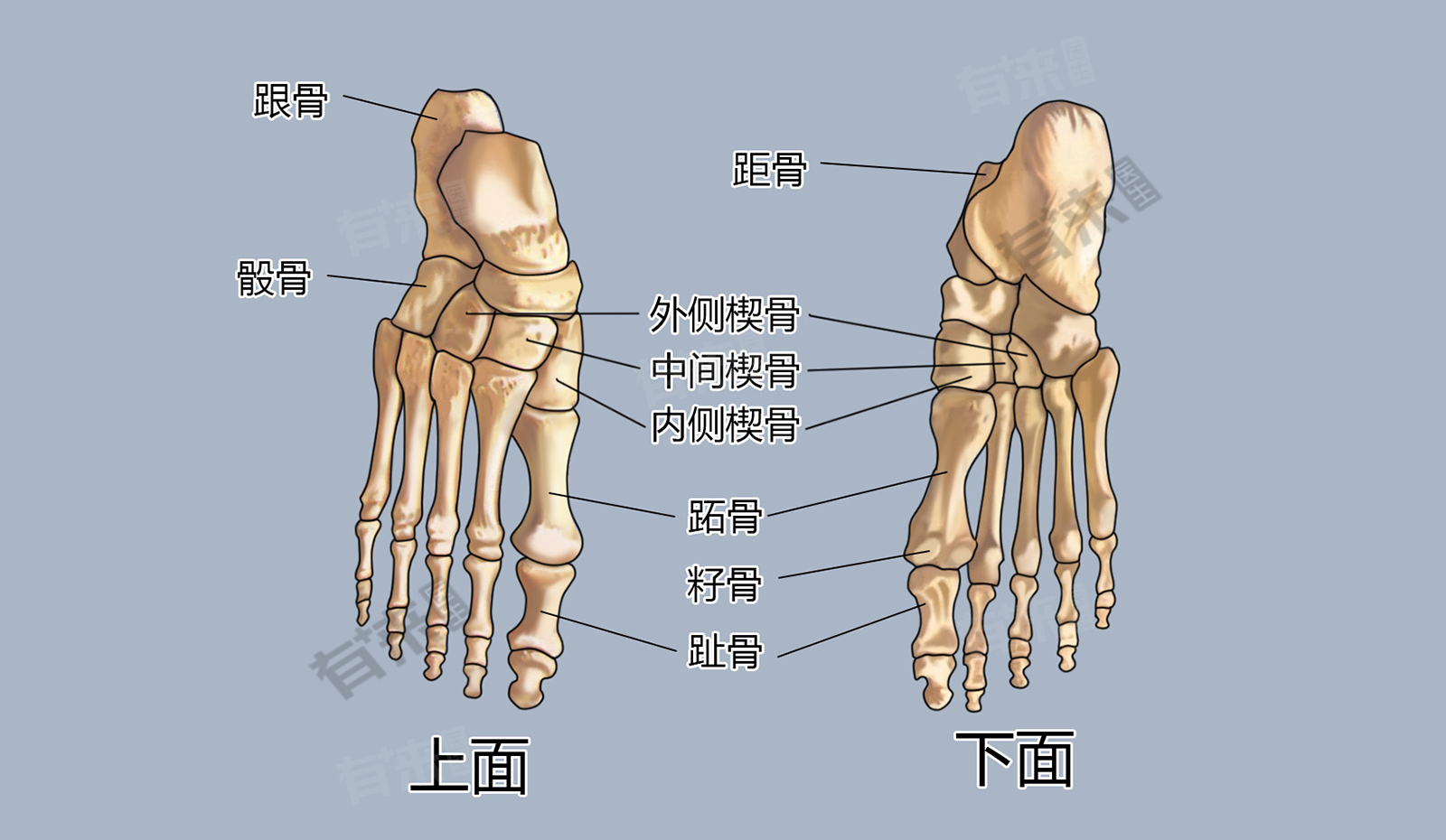 - 它们在支撑身体重量、维持足弓结构以及实现行走、跑步等活动中扮演着至关重要的角色,每根跖骨都与相应的跗骨(脚后段的骨骼)相连,并且各自连接到一个脚趾,形成了足部的前半部分。