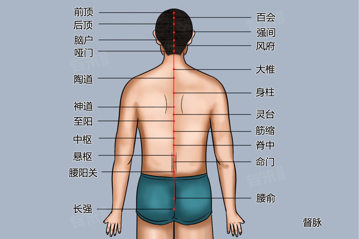 督脉穴位较多,包括长强穴、腰阳关穴、命门穴、大椎穴等,位置、主治均有所差异。需要在专业医生指导下,根据患者的具体情况选择合适的穴位和操作方法。