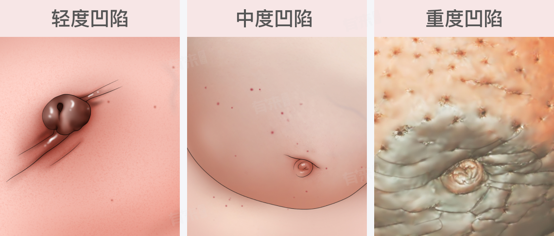 乳头凹陷主要是指乳头不突出于乳晕平面,甚至凹陷于乳晕之下的情况,其可按照乳头凹陷的程度和外观表现来进行分点讲述。