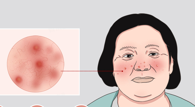 11、玫瑰痤疮:又称酒渣鼻,是一种累及面部皮肤血管和毛囊皮脂腺单位的慢性炎症性皮肤病。患者可能出现鼻部的丘疹、脓疱,并伴有皮肤持久性潮红、面颊部毛囊口扩大等表现。