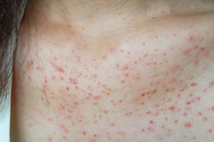 3、接触性皮炎:皮肤接触到某些外源性物质后,在接触部位发生的炎症反应。这些物质可能是衣物材质、金属饰品、化妆品、清洁剂等,胸前接触性皮炎的小红疙瘩形态多样,可为红斑、丘疹、水疱等,边界相对清晰,与接触物的形状和接触部位相符。