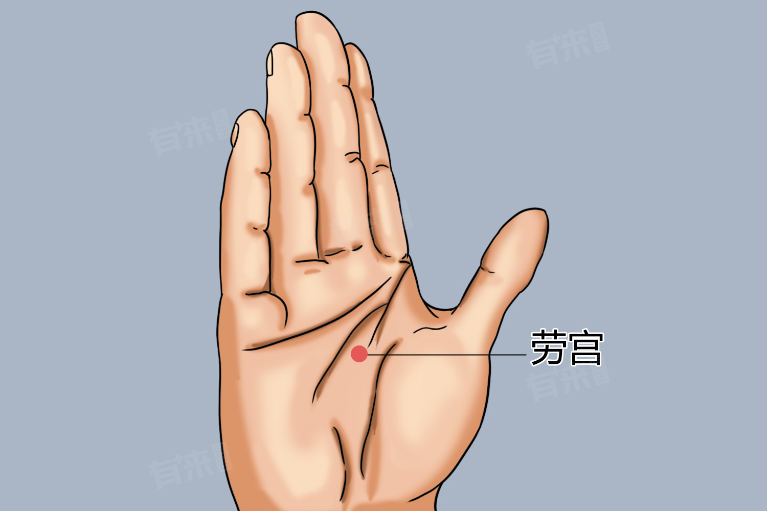 4、调和气血:劳宫穴是心包经的荥穴,具有调和气血、通经活络的功效。通过按摩劳宫穴,可以促进气血流通,缓解因气血不畅引起的各种症状,如月经不调、痛经、肩周炎等。