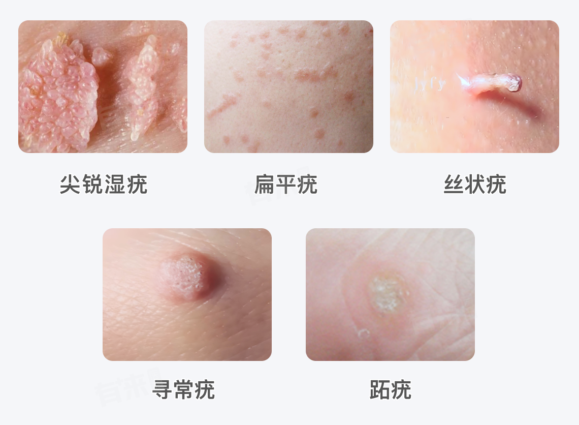- 低危型HPV常引发一些相对良性的疣体病变,如HPV-6和HPV-11是导致尖锐湿疣的常见低危型病毒。这类病毒引起的尖锐湿疣通常表现为生殖器及肛门周围的乳头状、菜花状或鸡冠状赘生物,颜色可呈淡红色、灰白色。