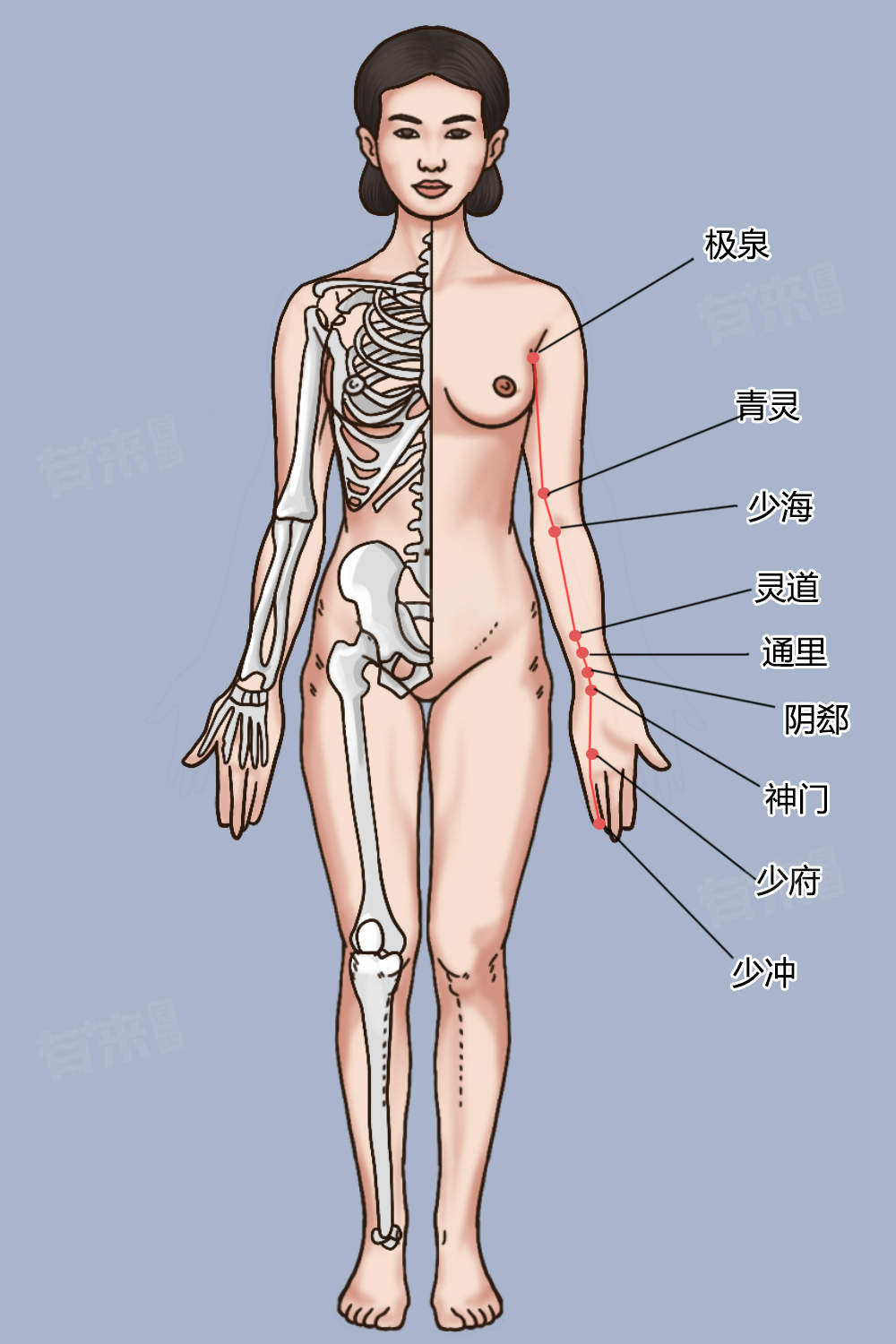 2、调节情志:心主神明,心经上的穴位对情志病也有很好的治疗效果。例如针灸心经上的穴位可以用于治疗癫狂痫证等精神类疾病,帮助患者平复情绪,恢复神志。