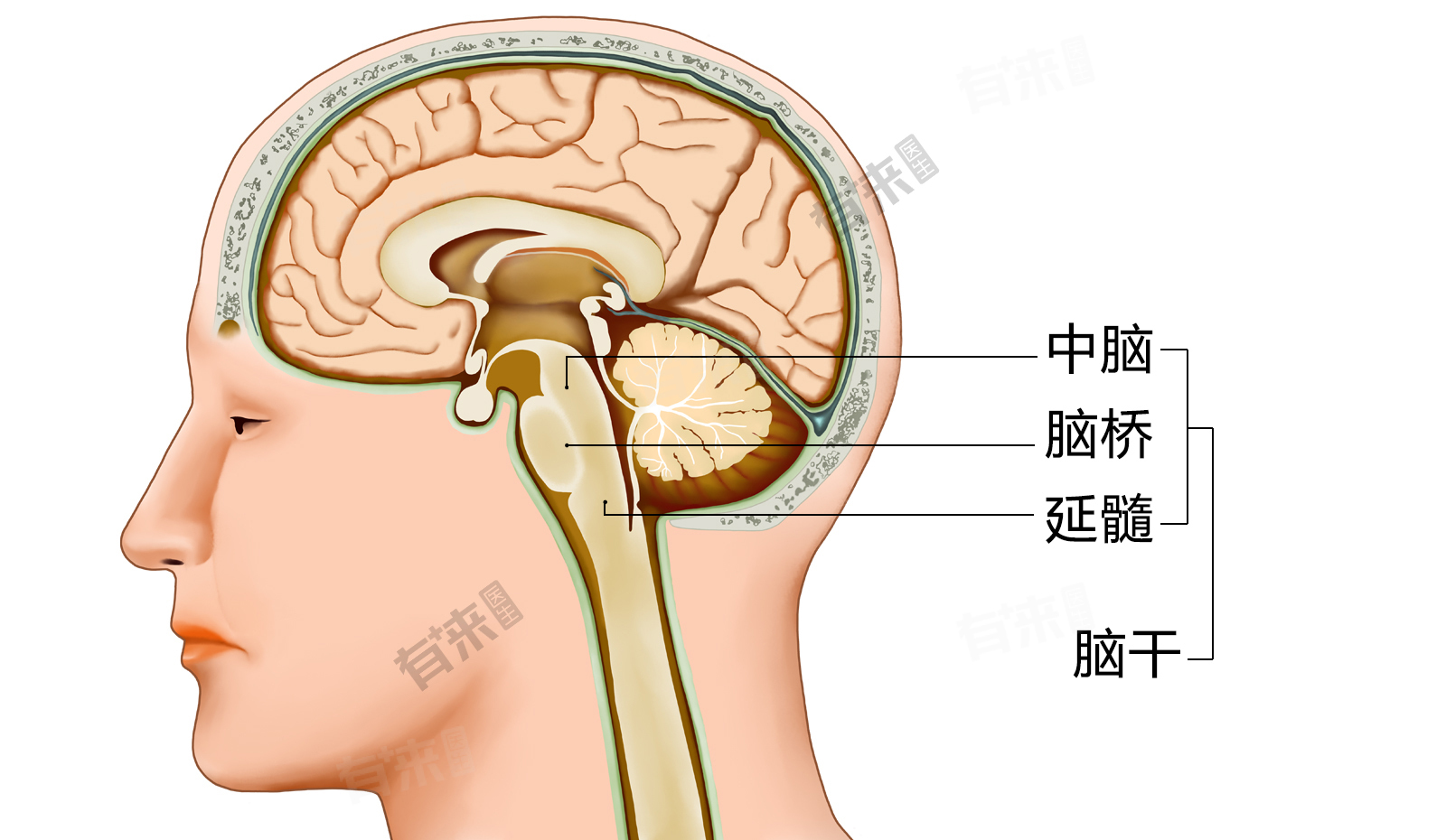 - 后脑勺在医学上被称为后枕部,主要由骨骼、神经、皮肤组织等构成。脑干则位于区域内部,被颅骨所包围。从外部触摸或观察时,无法直接看到或感觉到脑干的存在。但后脑勺部位的疼痛或异常感觉,有时可能与脑干或其周围结构的病变有关。