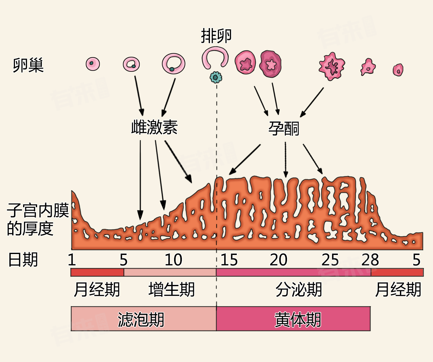 5、卵巢功能减退:随着年龄增长,卵巢功能逐渐衰退,卵泡数量减少,卵子质量下降,雌激素和孕激素分泌不足,会使月经周期逐渐延长,经量减少。