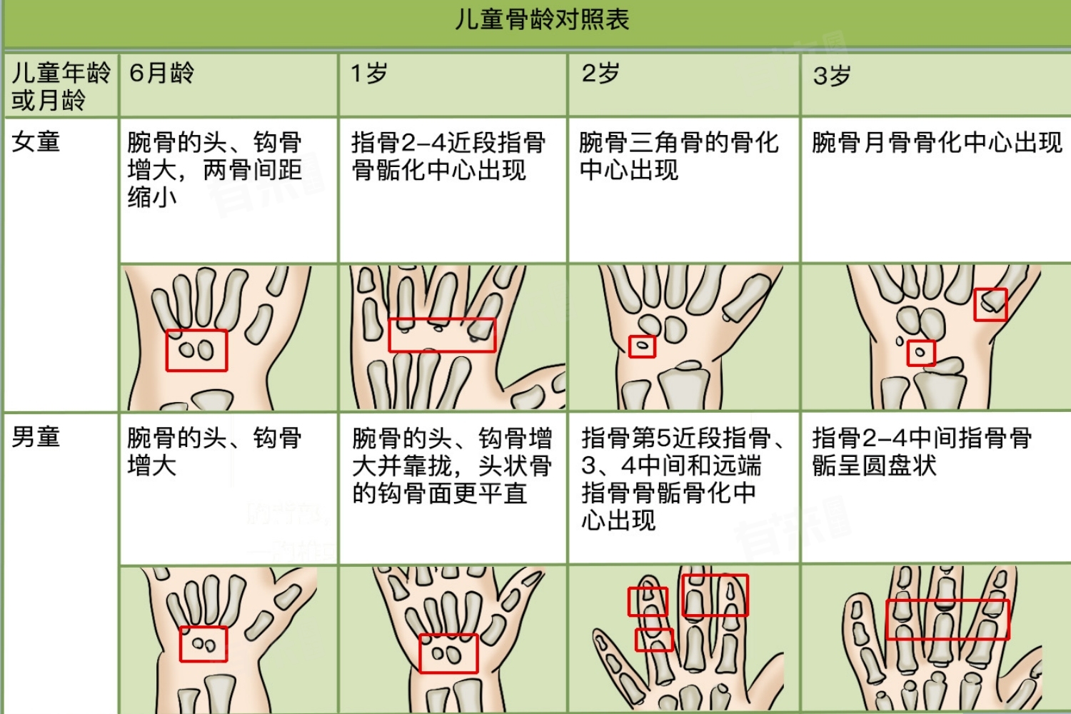不同年龄段,身体各部位的骨化中心会按特定顺序出现。以手腕部为例,婴儿出生时大多没有骨化中心,随后头几年内,各骨化中心陆续出现,如头骨、钩骨等。通过对比骨龄片中骨化中心的数量和出现顺序,与标准图谱相对照,能较为准确地确定骨龄,以此评估孩子骨骼发育是否与实际年龄相符。