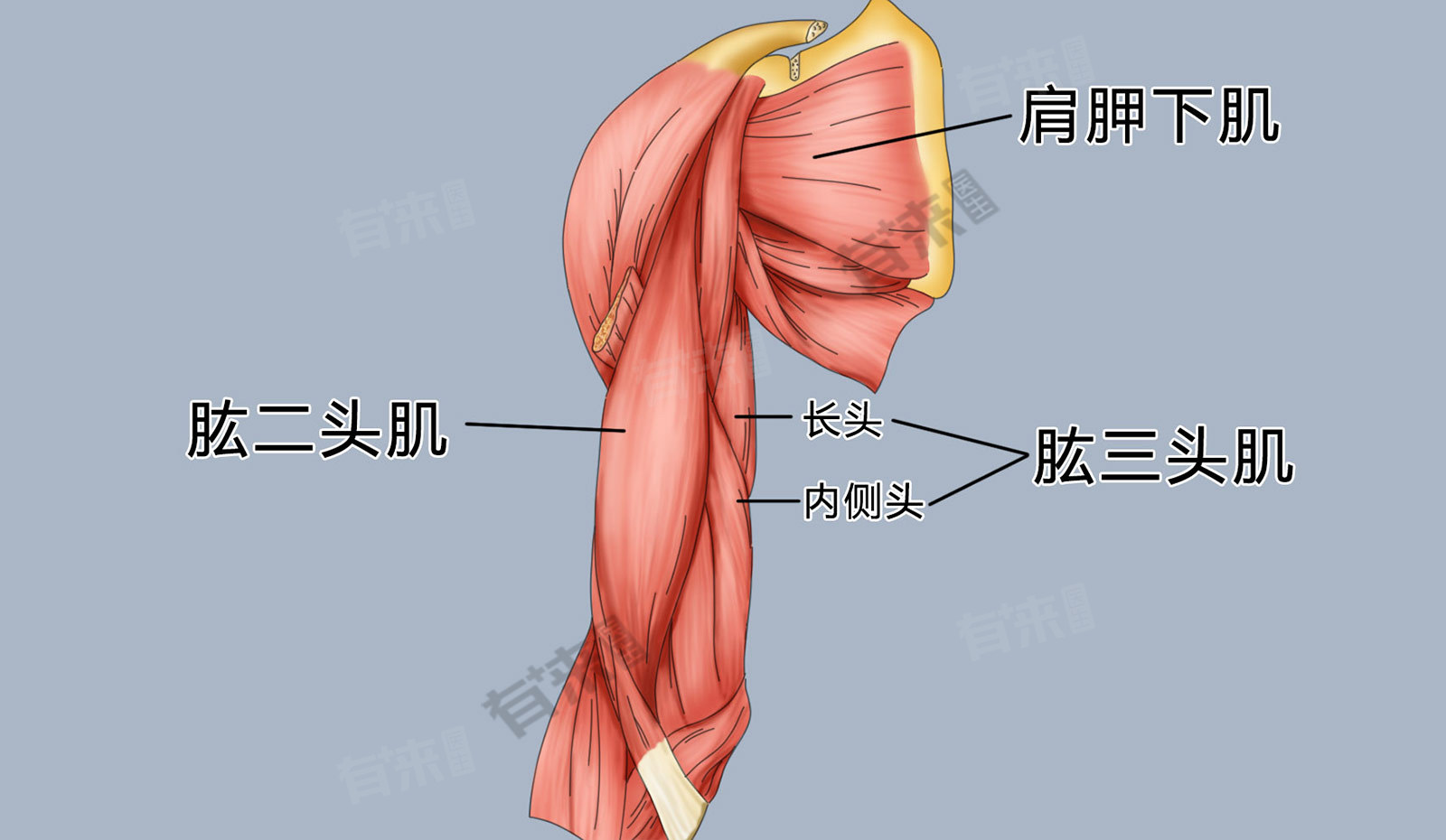 - 与其他肌肉的毗邻位置:二头肌内侧与肱肌相邻,外侧靠近三角肌。肱肌主要协助肘关节屈曲,与二头肌在功能上有协同性。三头肌与背阔肌、三角肌后束相邻,在手臂伸展动作中,这些肌肉相互配合。