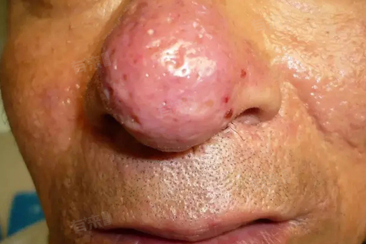 - 进一步发展的酒渣鼻可能导致丘疹和脓疱的形成,类似于痤疮的表现形式,但没有黑头或白头粉刺。这些皮损通常伴有瘙痒感和灼热感,给患者带来不适。更严重的情况下,某些患者的鼻部皮肤会增厚,导致鼻形增大,医学上称为“鼻赘”。虽然这种情况较为少见,但它确实影响了外观,并可能造成心理压力。