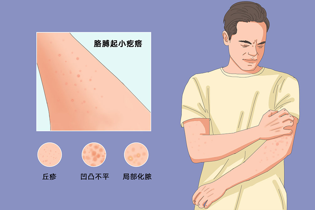2、毛囊炎:毛囊受感染时会发生毛囊炎,这通常是由细菌(如金黄色葡萄球菌)引起的,疙瘩可能伴有红晕和疼痛。