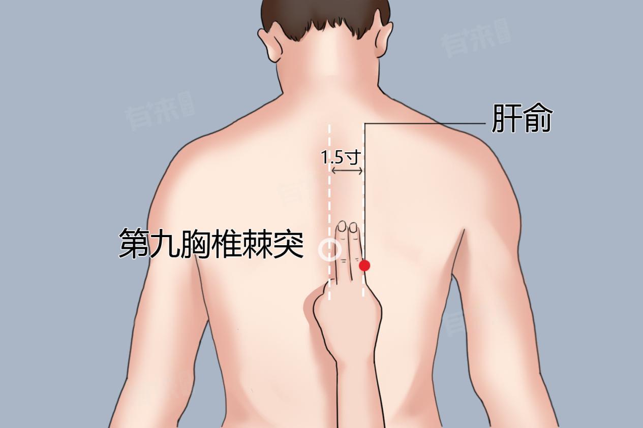- 旁开1.5寸定位肝俞穴:在第九胸椎棘突下,从脊柱正中线向外侧量取1.5寸的距离,即为肝俞穴的准确位置。