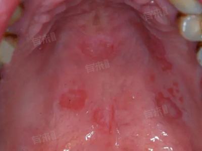 6、口腔疱疹:由单纯疱疹病毒感染引起的疾病,会在上腭部位形成疱疹,疱疹破溃后形成糜烂面,导致此种表现。
