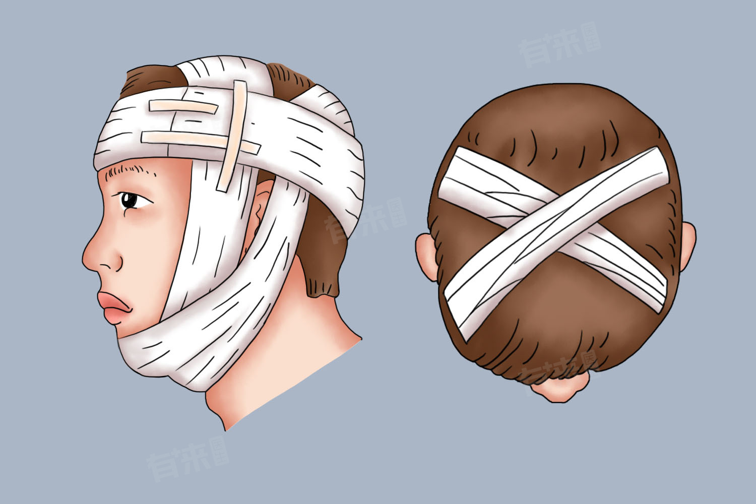 3、头套包扎法:头套包扎法适用于头顶部外伤出血且需要加压止血的情况,使用特制的头部加压包扎套或弹力绷带,先覆盖无菌纱布于伤口上,再套上头套并适当调整松紧度,确保既能止血又能避免压迫过紧导致的不适。