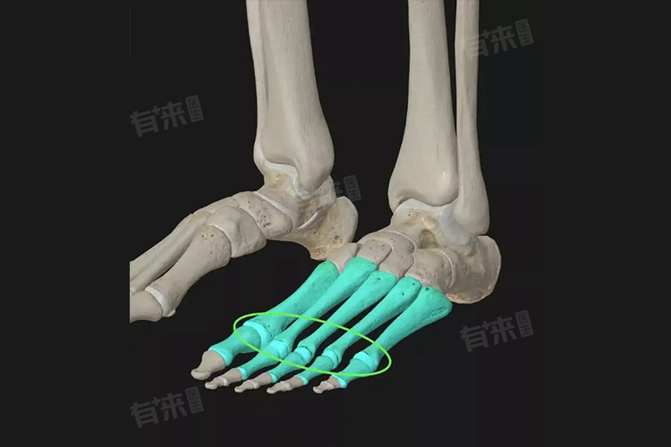 跖趾是指足部的跖骨与趾骨相连的部位。足部由跗骨、跖骨和趾骨组成。跖骨是连接跗骨和趾骨的长骨,共5块,从足内侧(大脚趾侧)向足外侧依次为第1-5跖骨。趾骨是构成脚趾的骨头,除了大脚趾有2节趾骨外,其余脚趾均有3节趾骨。跖趾关节就是跖骨的远端与相应趾骨的近端构成的关节,如大脚趾的跖趾关节就是由第1跖骨远端和大脚趾的近节趾骨近端组成。