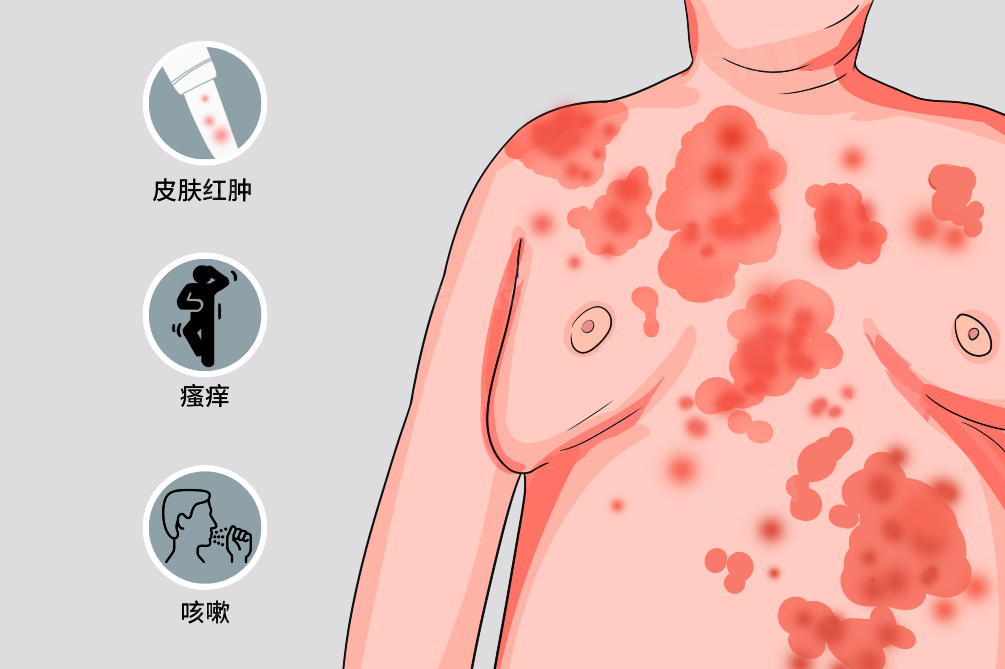 - 皮肤红疹:全身皮肤都可能受到酒精的刺激,导致毛细血管扩张,进而出现红疹。这些红疹可能表现为大小不一的风团,有时也可能呈现为丘疹或丘疱疹。