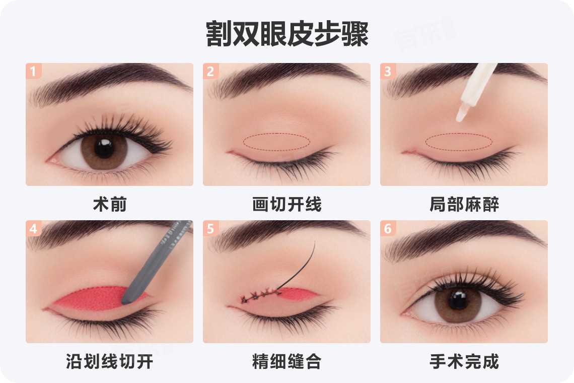 - 切开法:沿标记线切开皮肤,分离皮下组织,去除多余脂肪与松弛皮肤,调整眼轮匝肌厚度,最后缝合固定睑板与皮肤形成重睑。