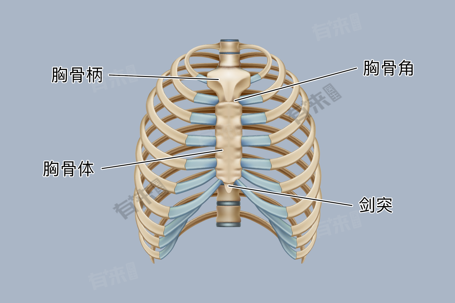 - 这是因为胸廓是由胸椎、肋骨、胸骨等共同构成的骨性结构。胸骨自上而下分为胸骨柄、胸骨体和剑突三部分。剑突位于最下端,其位置相对固定,与周围的骨性结构形成特定的空间关系。