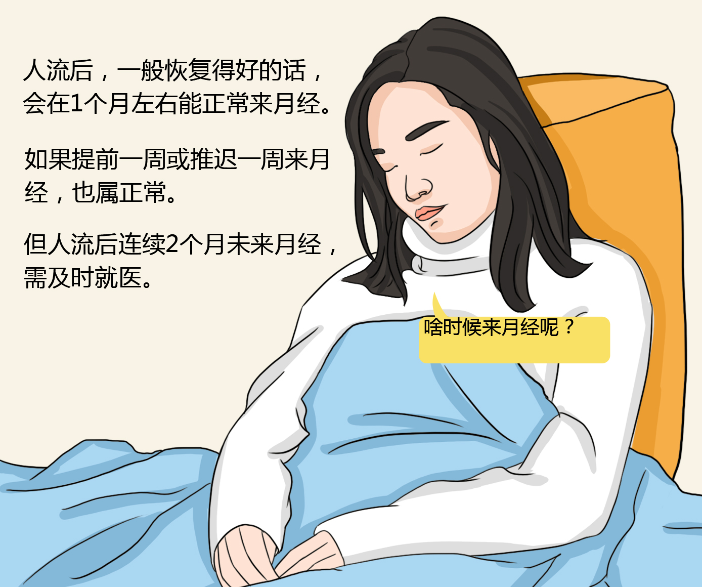 - 但少数女性手术后身体可能会比较虚弱,身体恢复相对比较缓慢,偶尔也伴随腹痛、阴道出血等症状,此时可能在术后1个月左右才来月经,也是正常的情况。建议在手术之后配合医生进行复查,明确是否存在异常的表现,发现异常及时处理。