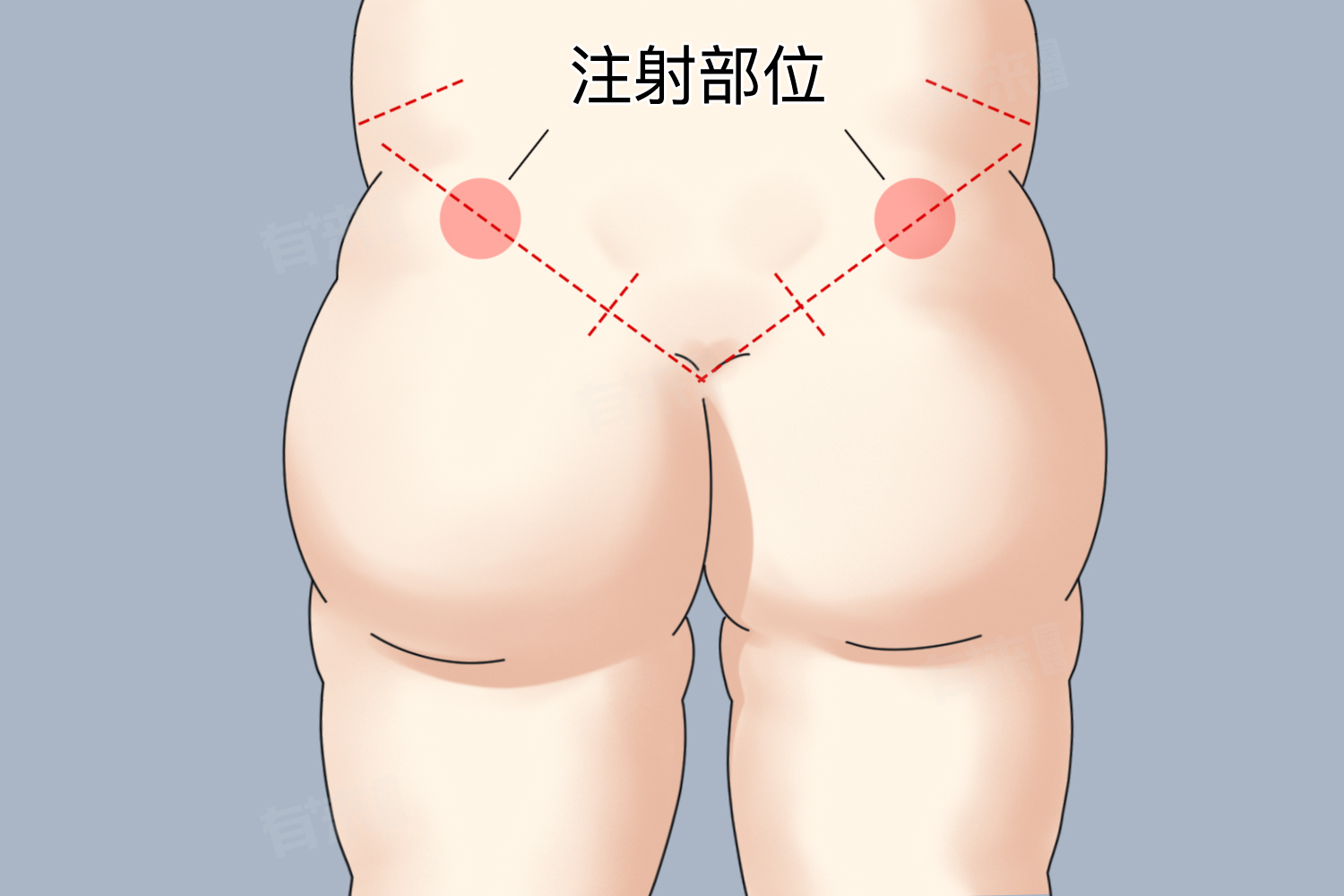 - 对于成年人而言,常采用十字法来定位臀部注射区域。通常是从臀裂顶点向左或向右侧划一水平线,然后从髂嵴最高点作一垂直平分线,将臀部分为四个象限,其中外上象限就是注射的理想部位。这个区域内神经和大血管分布相对较少,能降低注射过程中损伤神经血管的概率,比如可以避免损伤坐骨神经等重要结构,如果坐骨神经受损,可能会导致下肢疼痛、麻木甚至运动障碍等严重后果。