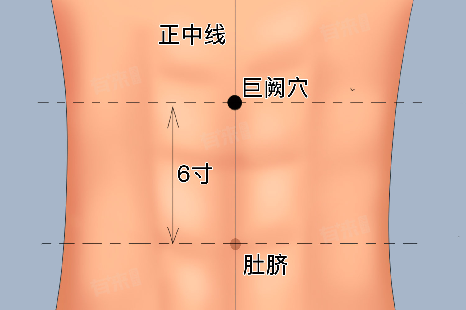 - 取穴方法:在寻找巨阙穴时,可以采取仰卧位,以便更准确地定位。首先确定脐中位置,然后向上量取6寸的距离,即为此穴。此处的“6寸”是中医常用的度量单位,可根据个人体型适当调整。