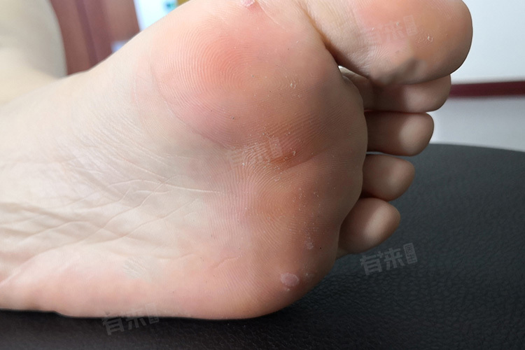3、跖疣:是由人乳头瘤病毒感染引起的,当足部皮肤有微小破损时,HPV病毒可能会趁机侵入,导致脚底局部皮肤细胞异常增生,形成硬块。跖疣表面粗糙,有黑色出血点,数目不等,常多发,会随着时间逐渐增大,影响正常的行走和站立。