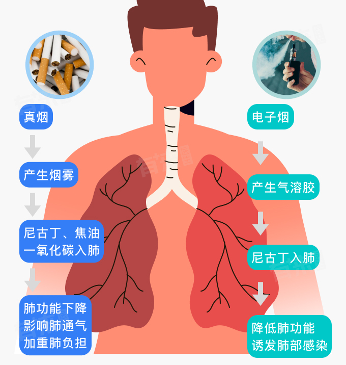 - 化学成分影响:电子烟中除了尼古丁外,还含有丙二醇、甘油、食用香精等多种化学成分。这些成分在加热雾化的过程中可能产生甲醛、烟碱等有害物质,对肺部产生刺激和损害。