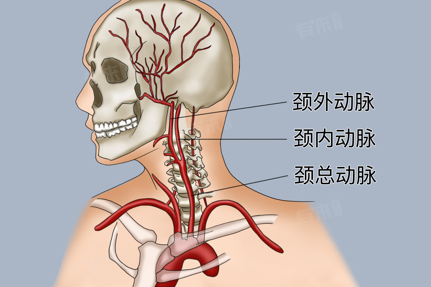 - 颈动脉分为颈内动脉和颈外动脉,颈内动脉主要负责向大脑前3/5部分供血,维持大脑正常功能,为脑组织提供氧气和营养物质;颈外动脉则分支供应头面部、颈部的组织和器官,包括头皮、面部皮肤、咀嚼肌等。