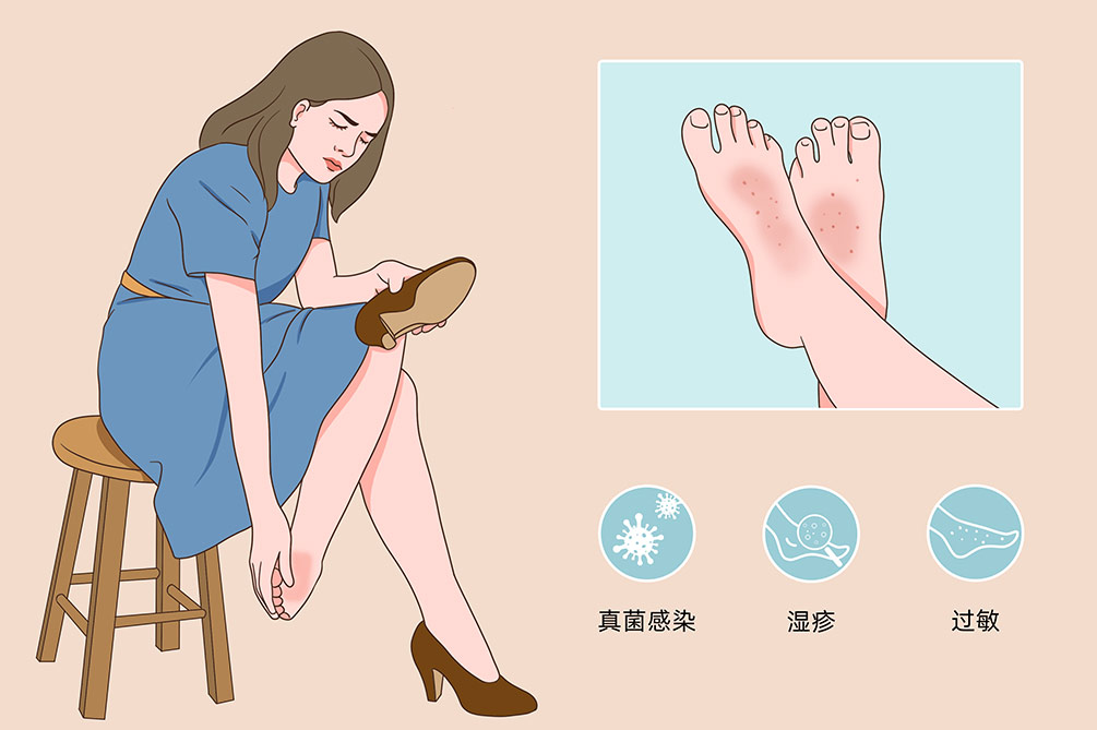 3、湿疹:湿疹好发于在脚背,可出现瘙痒以及红斑、红点、丘疹,需要遵医嘱使用炉甘石洗剂、丁酸氢化可的松乳膏进行治疗。