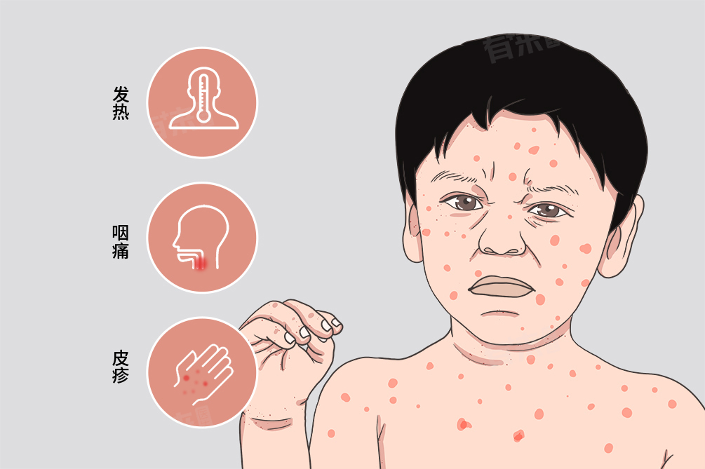 - 皮疹通常在发热后的1-2天内出现,首先出现在面部,然后迅速扩散到全身,但手掌、足底大多无疹。皮疹初起呈细点状淡红色斑疹、斑丘疹或丘疹,直径为2-3mm。面部、四肢远端皮疹较稀疏,部分融合类似麻疹;躯干尤其背部皮疹密集,融合成片,类似猩红热。皮疹一般持续3天消退,出疹时伴有低热,出疹后体温逐渐下降。出疹期常伴全身浅表淋巴结肿大,其中尤以耳后、枕部、颈后淋巴结肿大最明显,肿大淋巴结轻度压痛,不融合,不化脓。