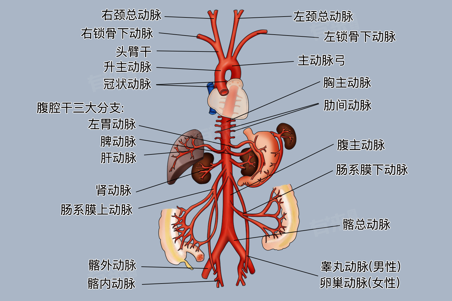 3、上肢:从腋窝开始,上肢的动脉包括腋动脉、肱动脉和桡动脉等。这些动脉沿着上肢走行,为手臂和手提供血液。特别是中医号脉的区域,如腕部的桡动脉,是上肢动脉的重要代表。