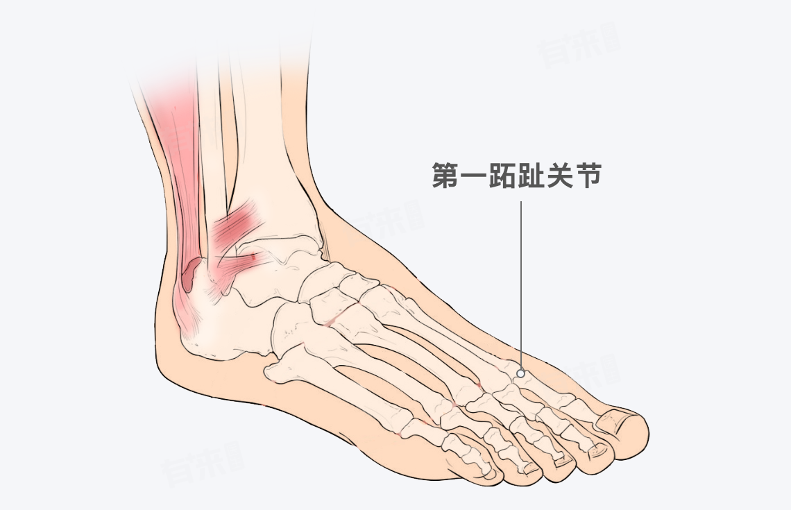 此外,第一跖趾关节的皮下组织较薄,缺乏丰厚的脂肪和肌肉保护,使得其在受到外力撞击、挤压或长期摩擦时更容易受损。痛风性关节炎、类风湿关节炎等疾病也常累及此处,因为关节周围的血液循环特点,使得尿酸盐结晶等物质容易在此沉积,引发炎症反应,出现疼痛、肿胀等症状。