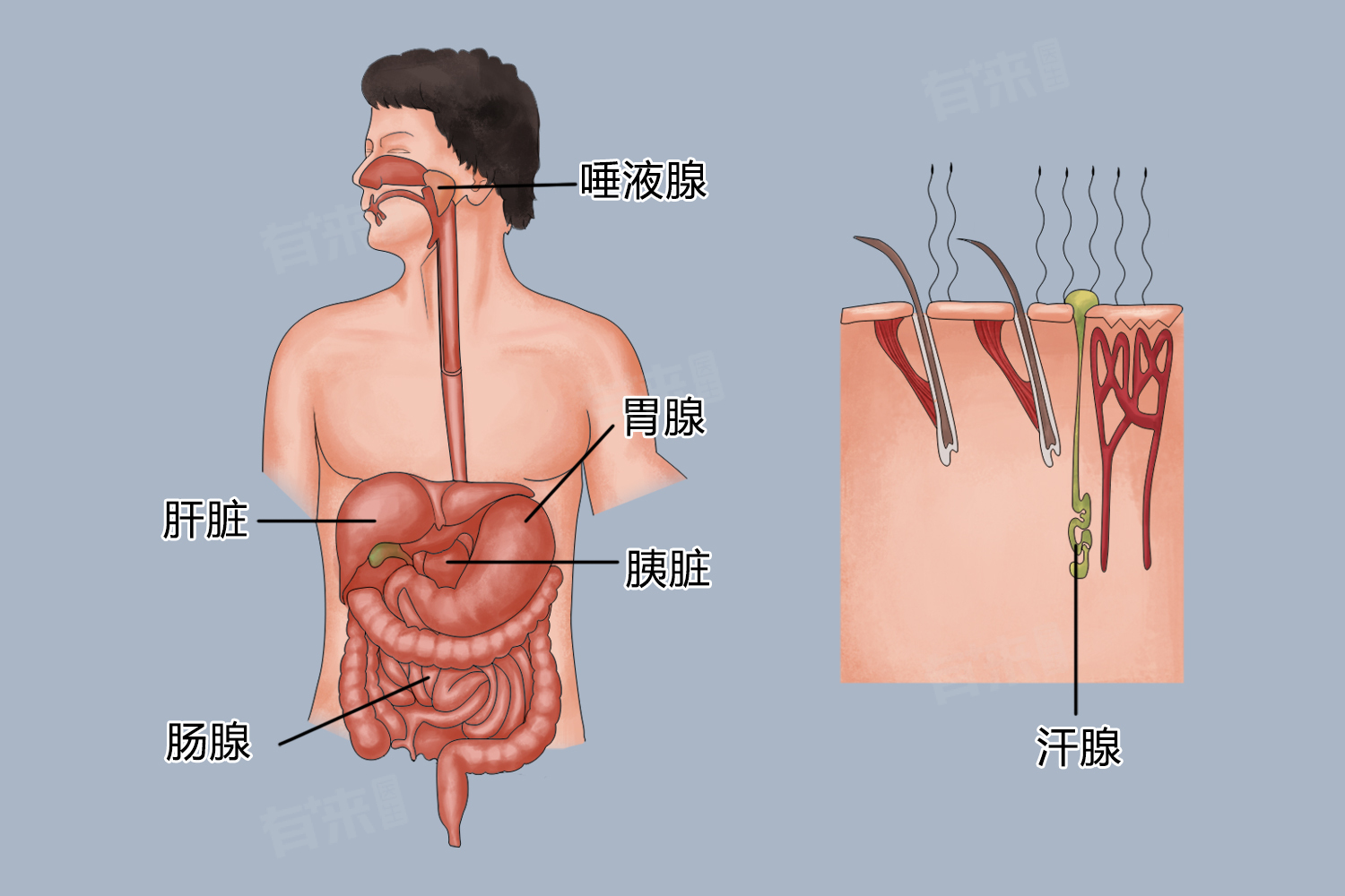 外分泌腺是一类具有导管的腺体,其分泌物通过导管排出体外,不进入血液,主要的外分泌腺有唾液腺、汗腺、皮脂腺、胃腺等。