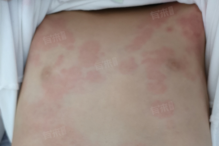 - 风团:风团是过敏性荨麻疹最典型的皮肤表现,风团通常为大小不一、形状不规则的扁平隆起,颜色可为淡红色或苍白色,周围常有红晕。风团的出现具有突然性,可在短时间内迅速增多或融合成片,且伴有明显的瘙痒感。