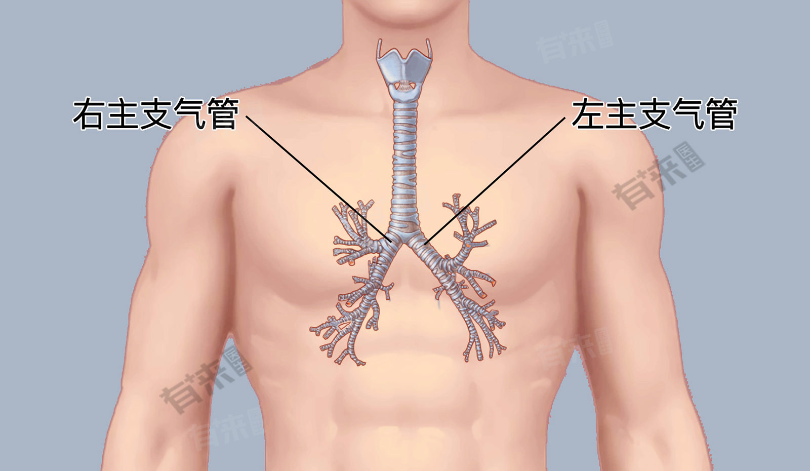 - 走行方向不同:右主支气管较为陡直,几乎是垂直地从气管分出,与气管中线的延长线形成约20-30°的夹角。左主支气管走行较为倾斜,与气管中线的延长线形成约40-55°的夹角。