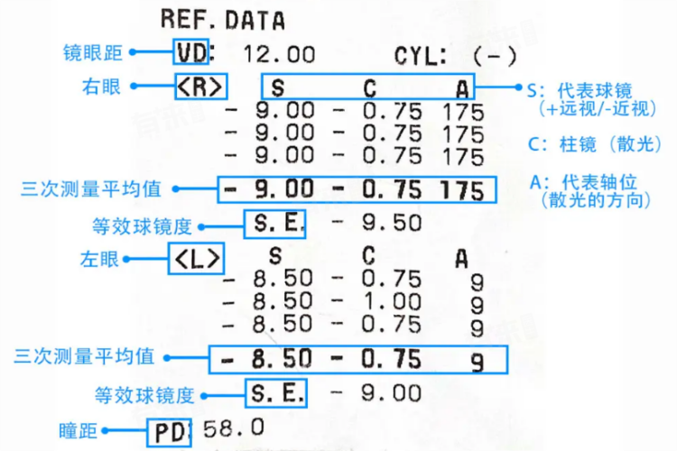 此外,OD表示右眼,验光单上关于右眼的各项数据会在“OD”栏下显示。OS表示左眼,左眼的验光数据则在“OS”栏下。有时也会用“R”表示右眼,“L”表示左眼。SE代表等效球镜,是综合考虑球镜和柱镜后得出的一个近似值,用于大致评估眼睛的整体屈光状态。