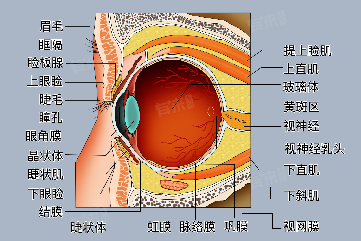 - 泪器:负责分泌泪液,以滋润眼球表面并冲刷掉潜在的污染物。泪器包括泪腺和泪道两部分,泪腺位于眼眶外上方的泪腺窝内,泪道是泪液的排出通道。
