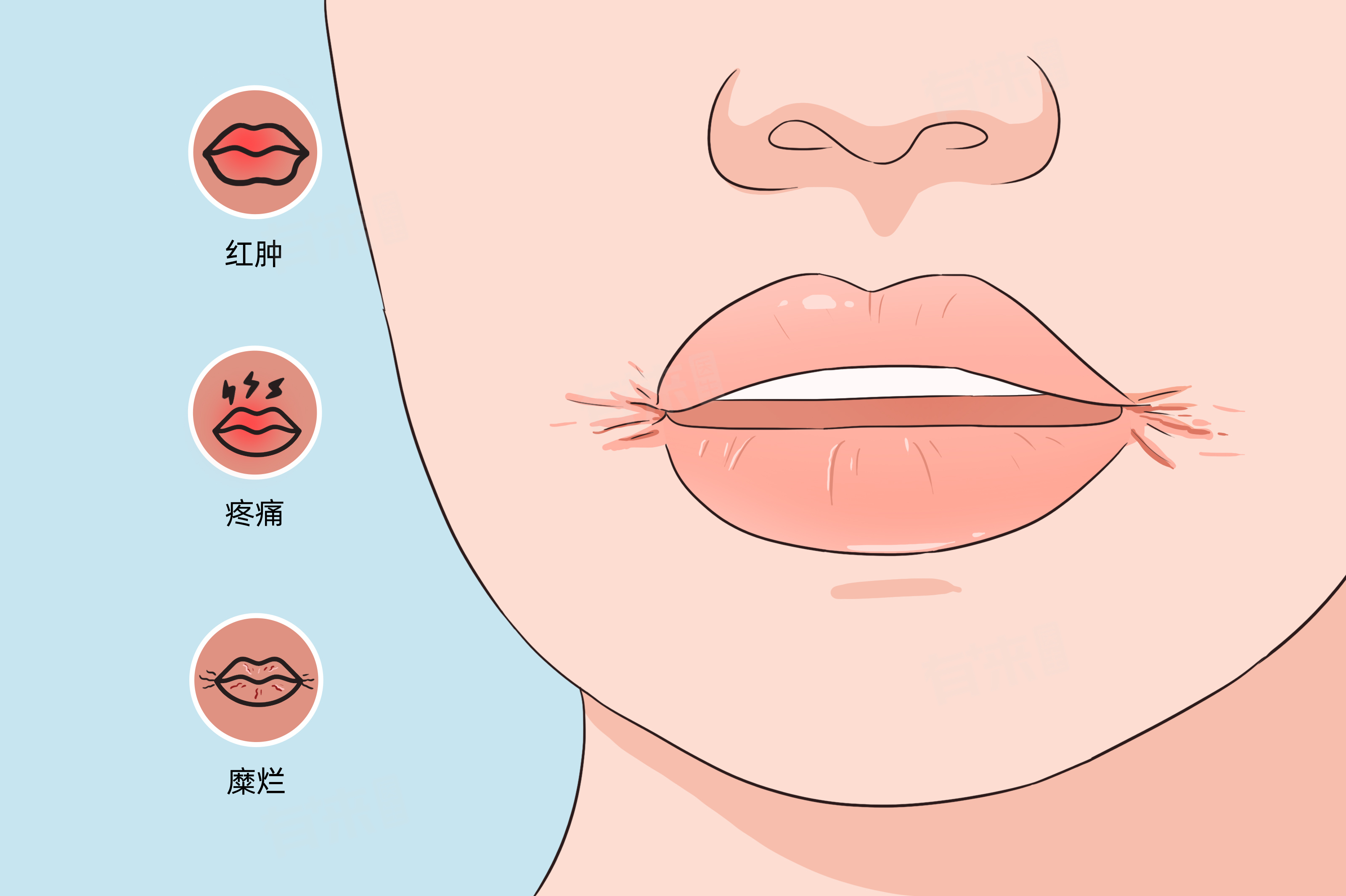 2、感染因素:多种病原体感染可导致嘴角开裂,细菌感染中,金黄色葡萄球菌常是罪魁祸首,在嘴角处滋生繁衍,破坏皮肤黏膜结构,引发炎症反应。真菌感染以白色念珠菌居多,嘴角相对潮湿的环境适宜其生长,大量繁殖后就会引发口角炎。病毒感染如疱疹病毒,会在嘴角形成水疱,水疱破裂后容易造成嘴角开裂,还可能伴有疼痛、瘙痒等不适。
